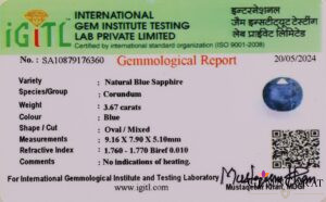 This exquisite Natural Blue Sapphire, certified by the International Gem Institute Testing Lab, weighs 3.67 carats. Belonging to the Corundum species, it features a stunning blue hue and an elegant oval/mixed cut. With dimensions of 9.16 x 7.90 x 5.10 mm and a refractive index of 1.760 – 1.770, this gemstone is free from any indications of heating, ensuring its natural beauty.