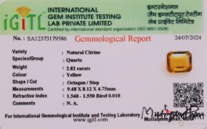 Introducing our stunning Natural Citrine gemstone, a member of the Quartz family, weighing 2.82 carats. This exquisite gem features a vibrant yellow hue and is expertly cut in an octagon step shape, measuring 9.48 x 8.12 x 4.75 mm. With a refractive index ranging from 1.540 to 1.550 and a birefringence of 0.010, this citrine boasts remarkable clarity and brilliance. Perfect for creating a standout piece of jewelry or adding to your gemstone collection, this Natural Citrine is a true testament to nature’s beauty.