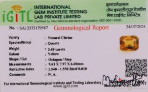 Introducing our stunning Natural Citrine gemstone, a member of the Quartz family, weighing 3.68 carats. This exquisite gem features a vibrant yellow hue and is expertly cut in an octagon step shape, measuring 9.61 x 7.97 x 6.60 mm. With a refractive index ranging from 1.540 to 1.550 and a birefringence of 0.010, this citrine boasts remarkable clarity and brilliance. Perfect for creating a standout piece of jewelry or adding to your gemstone collection, this Natural Citrine is a true testament to nature’s beauty.