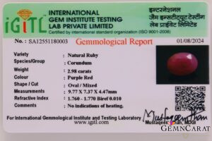 This beautiful Ruby weighs 2.98 carat has a very pleasant purple red colour cut in oval shape with a mixed style of cutting with best polish. This ruby is untreated and certified by IGITL laboratory, Jaipur.