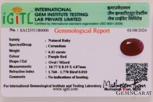 This beautiful Ruby weighs 4.31 carat has a very pleasant purple red colour cut in oval shape with a mixed style of cutting with best polish. This ruby is untreated and certified by IGITL laboratory, Jaipur.