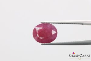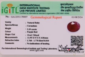 This beautiful Ruby weighs 5.39 carat has a very pleasant purple red colour cut in oval shape with a mixed style of cutting with best polish. This ruby is untreated and certified by IGITL laboratory, Jaipur.