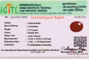 This beautiful Ruby weighs 6.73 carat has a very pleasant purple red colour cut in oval shape with a mixed style of cutting with best polish. This ruby is untreated and certified by IGITL laboratory, Jaipur.